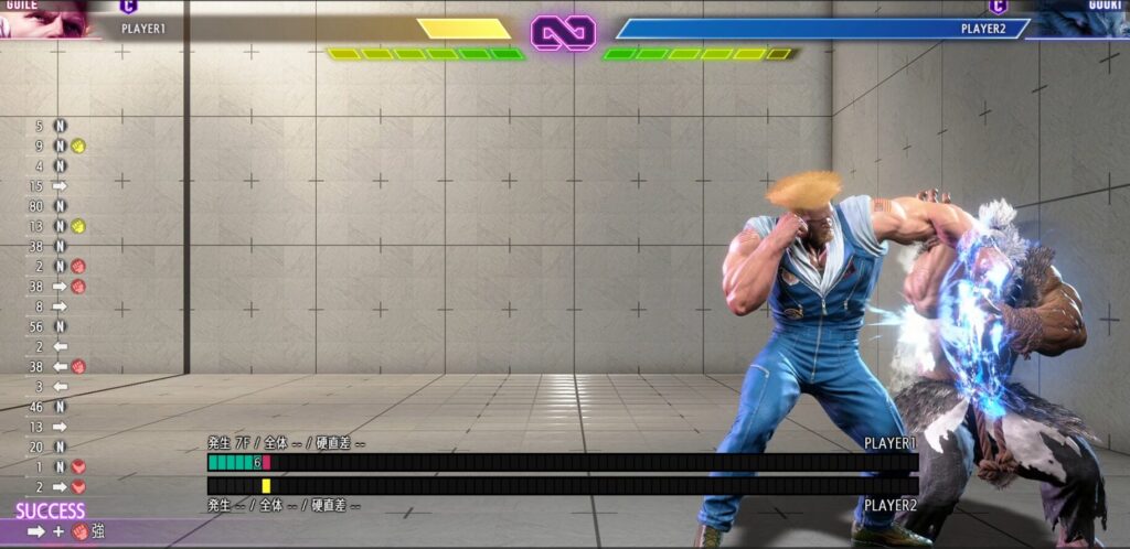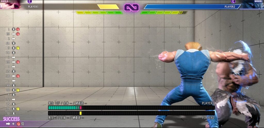 この技をガードした後、豪鬼側で発生最速の4フレームの技を出しても、ジェイミーの発生5フレームの強P(ぺちぺちパンチ)に負ける。